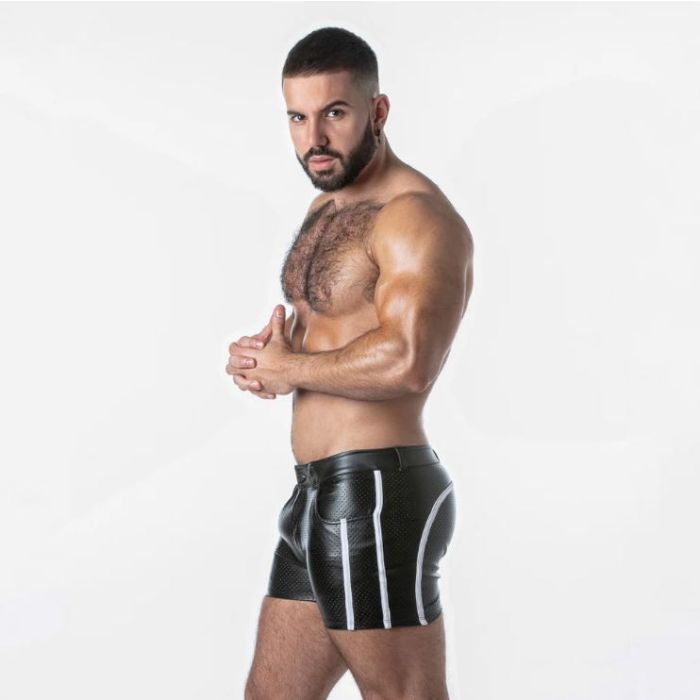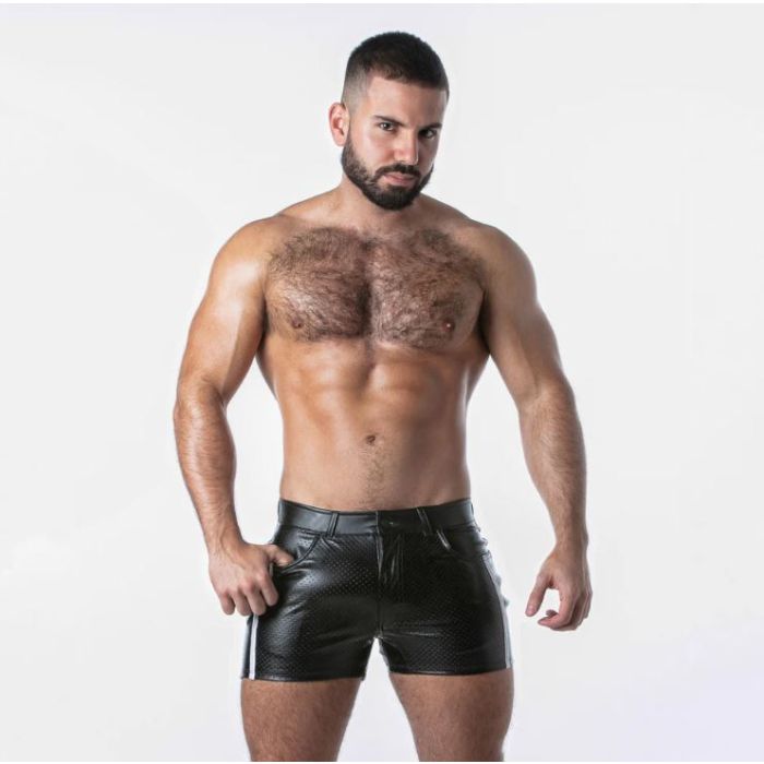 Deze mini short, vervaardigd uit het meest verfijnde perforated leatherette, biedt een unieke combinatie van stijl en functionaliteit. Het gebruik van contrastbinding accentueert de aantrekkelijke lijnen van het ontwerp, waardoor het een opvallende keuze is voor modebewuste individuen. Het populaire merk Locker Gear staat bekend om zijn gedurfde en trendy kleding, en deze short vormt daarop geen uitzondering.