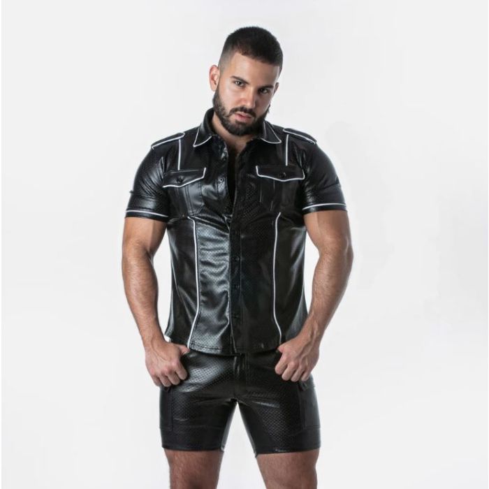 Dit korte mouwen overhemd is vervaardigd uit de fijnste perforated leatherette, wat niet alleen zorgt voor een luxe uitstraling, maar ook voor een ademend vermogen dat comfort biedt gedurende de dag. De perforaties in het materiaal dragen bij aan een moderne en trendy look, terwijl de contrast piping een subtiele maar opvallende accentuering biedt. Dit ontwerp maakt het overhemd geschikt voor zowel casual als meer formele gelegenheden, waardoor het een veelzijdige aanvulling is op elke garderobe.