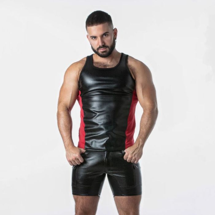 Deze tanktop, vervaardigd uit het meest verfijnde perforated leatherette, is een opvallend kledingstuk van het gerenommeerde gay merk Locker Gear. Het gebruik van hoogwaardig materiaal zorgt niet alleen voor een luxe uitstraling, maar ook voor een comfortabele pasvorm die de lichaamscontouren accentueert. De perforaties in de stof bieden een unieke esthetiek en zorgen voor een ademend effect, waardoor deze tanktop ideaal is voor zowel intieme gelegenheden als levendige feesten. De combinatie van stijl en functionaliteit maakt dit kledingstuk een must-have voor elke modebewuste man die zijn zelfvertrouwen wil uitstralen. Locker Gear staat bekend om zijn gedurfde en speelse ontwerpen die de LGBTQ+ gemeenschap vieren, en deze tanktop is daarop geen uitzondering. Het ontwerp is zorgvuldig samengesteld om een gevoel van vrijheid en expressie te bevorderen, waardoor het perfect is voor erotische feesten en andere sociale evenementen. De tanktop kan eenvoudig worden gecombineerd met verschillende outfits, van strakke jeans tot sportieve shorts, waardoor het een veelzijdig stuk is dat in elke garderobe thuishoort. De aandacht voor detail in de afwerking en het gebruik van duurzame materialen garandeert dat deze tanktop niet alleen stijlvol, maar ook langdurig is. Het dragen van deze tanktop van Locker Gear is meer dan alleen een modekeuze; het is een statement van zelfvertrouwen en trots. De tanktop is ontworpen om de drager te laten opvallen in een menigte, met een uitstraling die zowel gedurfd als verfijnd is. Of je nu een avondje uit gaat of deelneemt aan een speciaal evenement, deze tanktop zal zeker de aandacht trekken en gesprekken op gang brengen. Met zijn unieke combinatie van comfort, stijl en functionaliteit is deze tanktop een onmisbaar item voor iedereen die de wereld wil verkennen met flair en zelfverzekerdheid.