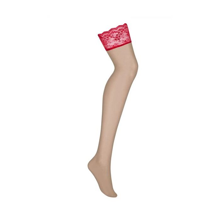 Presenteer jouw benen in de Lovica Kousen - Rood van Obsessive. Deze zachte jarretel kouisen zijn gemaakt poederkleurig nylon van hoge kwaliteit. Rood kant met mooie bloemetjes sieren jouw dijen op verleidelijke wijze. In deze kousen weet jij zeker dat jouw partner niet van je weg kan kijken.