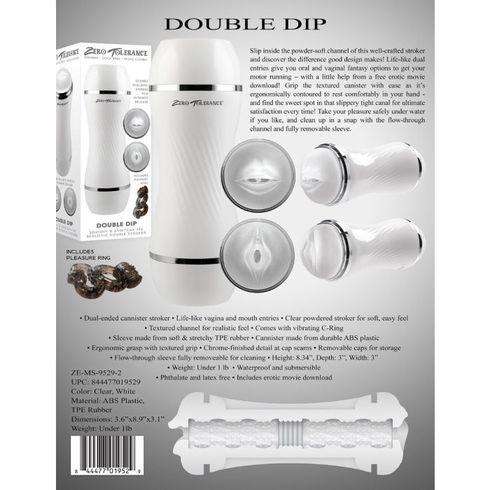 Met de Masturbator Double Dip van Zero Tolerance geniet je van een orale en vaginale opening. De masturbator voelt zacht en levensecht aan. Door de textuur aan de buitenkant en de ergonomische vorm ligt de masturbator comfortabel in de hand. Double Dip heeft een verwijderbare hoes, hierdoor is de masturbator gemakkelijk schoon te maken.