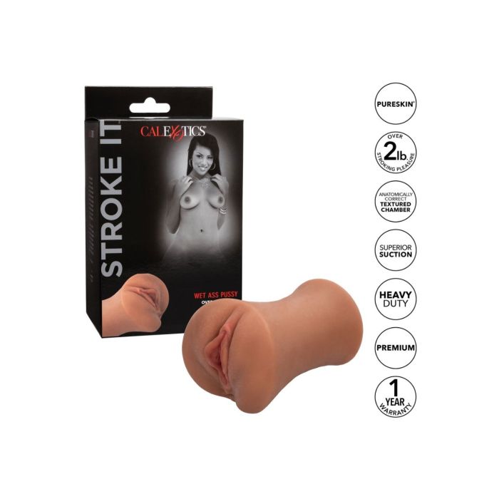 De Masturbator Stroke It Wet Ass Pussy van CalExotics is gemaakt van PureSkin materiaal. Stroke It Wet Ass Pussy is 18.5 cm lang en voelt realistisch aan. De binnenkant voelt levensecht aan en is niet van echt te onderscheiden. De uiteinde van de sleeve is gesloten. Gebruik wat glijmiddelen want zo krijg jij een heerlijke zuigkracht. Maak de masturbator na gebruik goed schoon met een toycleaner.