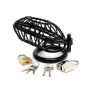 Met deze kuishuidsgordel zet jij de penis van je partner even op slot. De kuisheidsgordel is gemaakt van gedraaid materiaal en heeft een opening aan de bovenkant en aan de onderkant. Zo kan jij met een gerust hart de boodschappen in huis halen of een weekendje weg voor je werk. Met deze kuisheidsgordel weet jij zeker dat je lover zijn penis alleen maar voor jou bewaart. De kuisheidsgordel is voorzien van 2 maten ringen en een hangslotje om de boel op slot te draaien. Het ontwerp heeft wel wat weg van een vogelkooitje. Je kan door de tralies heen gewoon nog een plasje doen.