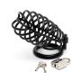Met deze kuishuidsgordel zet jij de penis van je partner even op slot. Zo kan jij met een gerust hart de boodschappen in huis halen of een weekendje weg voo rje werk. Met deze kuisheidsgordel weet jij zeker dat je lover zijn penis alleen maar voor jou bewaart. De kuisheidsgordel is voorzien van 2 maten ringen en een hangslotje om de boel op slot te draaien. Het ontwerp heeft wel wat weg van een vogelkooitje. Je kan door de tralies heen gewoon nog een plasje doen.