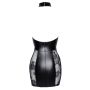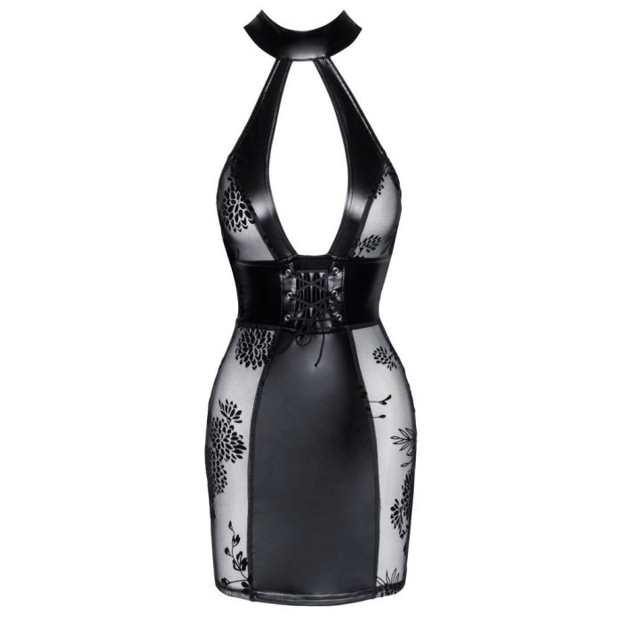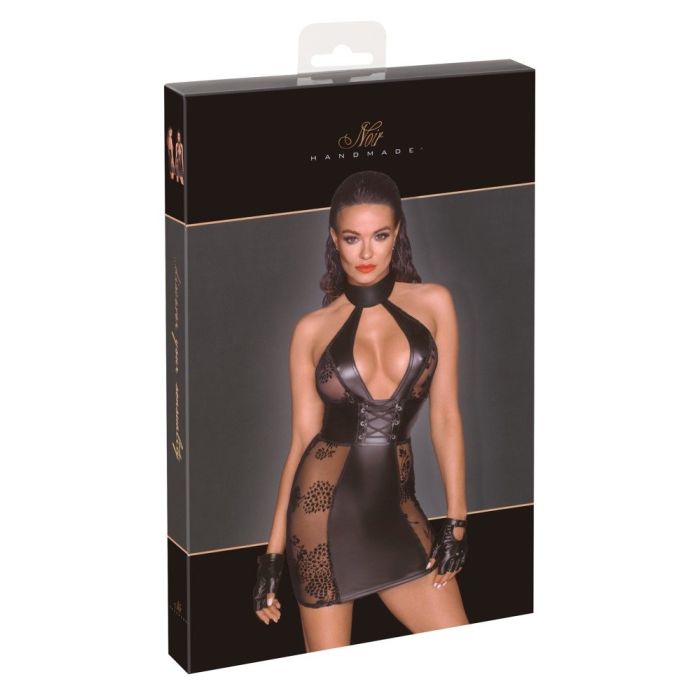 Deze sexy mini jurkje van Noir Handmade is gemaakt van een mix van mat zwarte stof in combinatie met transparante materiaal afgewerkt met fluwelen flockprint. Aan de achterkant is een ritssluiting ingezet waardoor hij eenvoudig uit gaat. De voorkant loopt door in de nek en die heeft aan de achterkant haaksluiting.