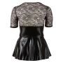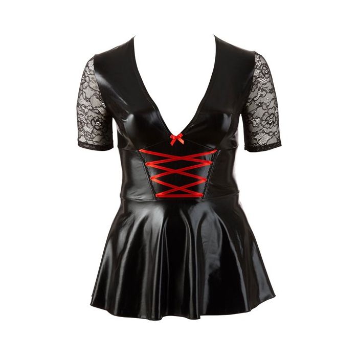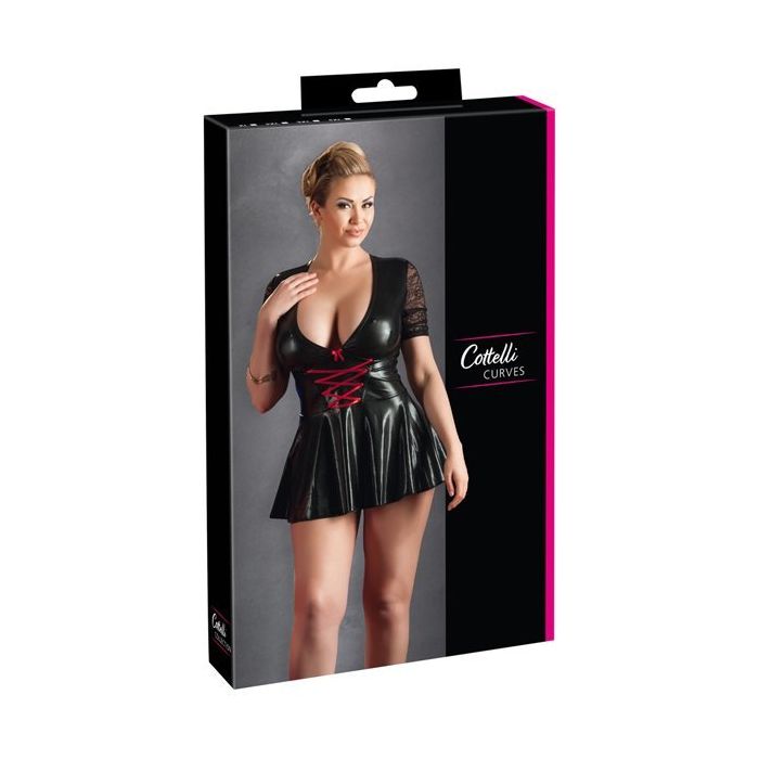 Dit korte jurkje uit de Cottelli Collection heeft een spannend design. Het Mini Jurkje Met Rood Rijglint heeft een laag uitgesneden decolleté en heeft een achterpand en mouwen van doorzichtig kant, met bloemen patroon. Het lijfje van het jurkje zit lekker strak om je lijf en vanuit de taille waaiert het jurkje uit in een geplooid rokje. Het rokje is lekker kort en wanneer je bukt blijft er dan ook niets geheim. Aan de voorkant is een opvallend rood rijgdetail aangebracht. Ideaal voor een spannende avond thuis of voor een kinky feest buiten de deur.