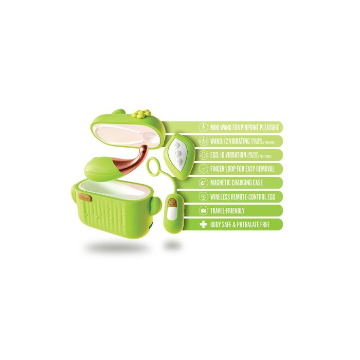 Daarnaast bevat de set een draadloos vibrerend ei met afstandsbediening, voor extra sensaties. Het ei heeft 10 vibratie-instellingen, inclusief 3 snelheden en 7 patronen, en kan eenvoudig worden opgeladen via USB aan de buitenkant van de case.