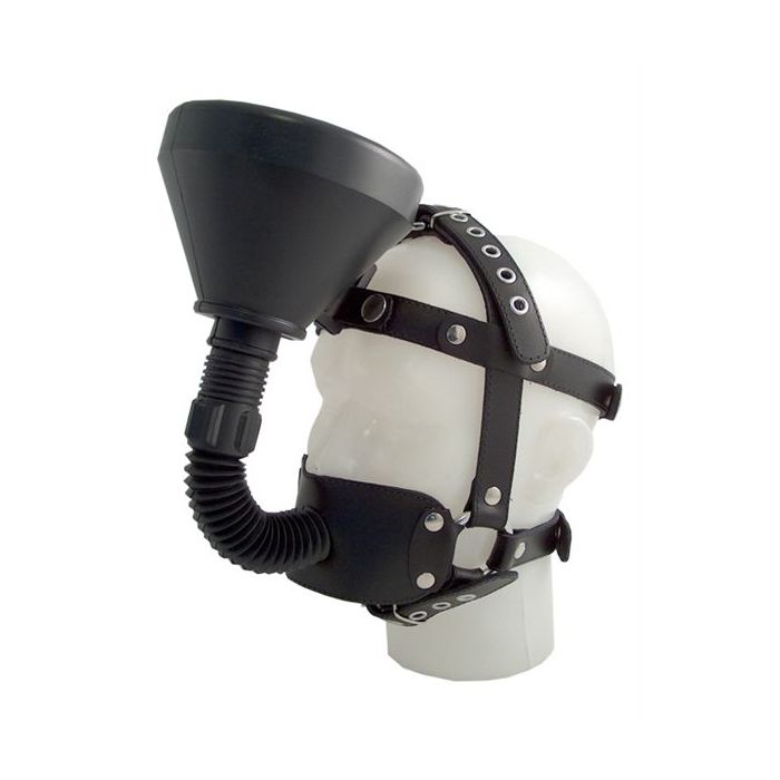 Door de trechter kun je je gozer elke vloeistof laten slikken die je wilt. Hij wordt vastgegespt op zijn hoofd zodat er geen ontsnappen mogelijk is. De trechter kan helemaal van het harnas afgehaald worden, zodat hij goed schoon gemaakt kan worden.