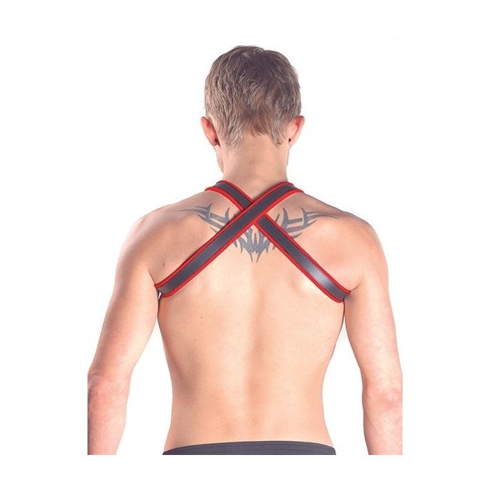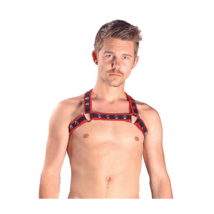 Dit mooie harnas van het gewelidge merk Mister B is gemaakt van hoogwaardig duurzaam leer welke een leven lang mee zal gaan. Het harnas is verkrijgbaar in twee maten, S/M en L/XL zodat jij de juiste pasvorm zal hebben. Het harnas is gemaakt van zwart leer met rondom een rode bies voor een geweldige look. Hij eindigt boven de borst en is voorzien van 2 O-ringen en diverse studs op het zwarte leer voor een geweldig stoere uitstraling. Op de rug is het harnas kruislings gevormd wat je rug prachtig uit zal laten komen.