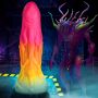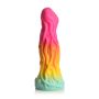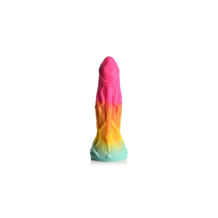 Deze kleurrijke, vormveranderende chimera-dildo is een opvallend en uniek seksspeeltje dat speciaal is ontworpen voor jouw plezier! Met zijn dikke en gestructureerde vorm zorgt deze dildo voor intense stimulatie. Het siliconen materiaal voelt hoogwaardig en flexibel aan, en is bovendien ftalaatvrij en veilig voor het lichaam. De schacht is voorzien van touwachtige aderen die zich kronkelen en kruisen, wat zorgt voor extra sensatie tijdens het gebruik. Het monsterlijke hoofd van de dildo is gerimpeld en rond, en vanaf de basis steekt een kleine hagedis met uitgestrekte armen uit die zich vasthoudt aan de regenboogkleurige schacht.