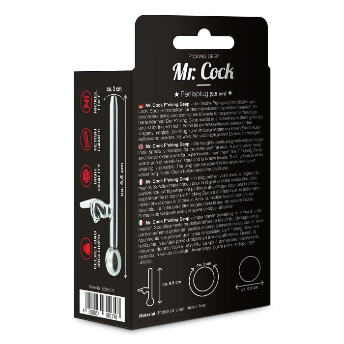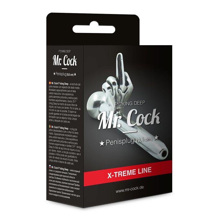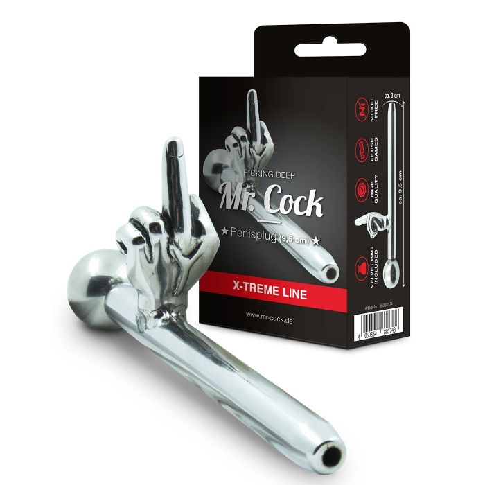 De Mr. Cock Penisplug Extreme Line Middelvinger van Mr. Cock is een penisplug die jij gebruikt voor het penetreren van je plasbuis. Deze fetish wordt steeds populairder onder de mannen. Deze penisplug is voorzien van een middelvinger voor een stoere look. De penisplug is van hoge kwaliteit en is nikkel vrij. De plug wordt geleverd inclusief opbergzakje om je penis plug in op te bergen.