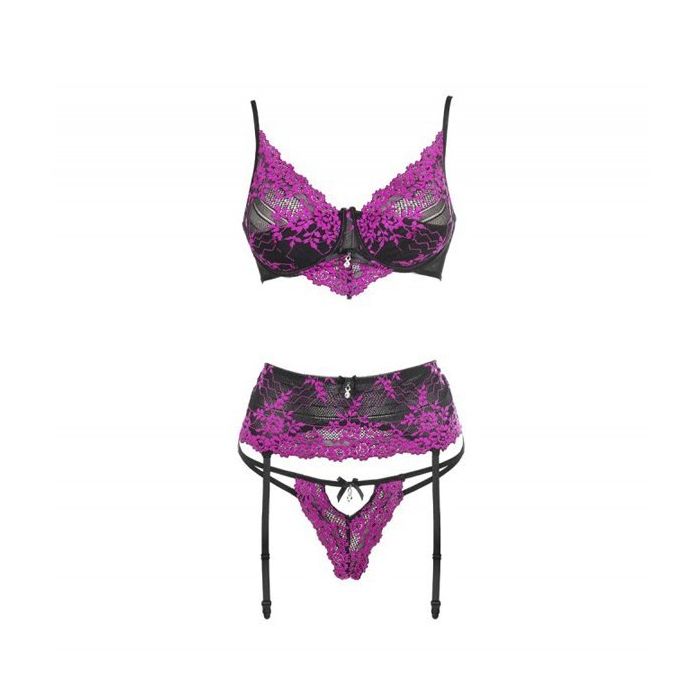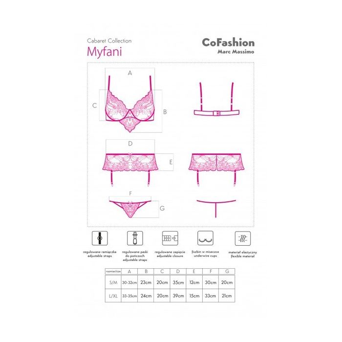 De Myfani Luxe Jarretel Set uit de Cabaret collectie van het merk CoFashion is een driedelige lingerie set gemaakt van heerlijk zachte en soepele materialen voor een perfecte pasvorm. De set bestaat uit een beugel bh, een jarretel gordel en een bijpassende string, alle drie gemaakt van sierlijk, tweekleurig bloemen kant voor een super verleidelijke uitstraling.