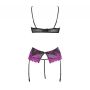 De prachtige bh heeft ongevoerde cups en de cups schijnen licht door. Het kant siert het decolleté op betoverende wijze en loopt ook door in een V-vorm naar onderen. De handige schouderbandjes zijn verstelbaar net als de jarretelbandjes aan de kanten jarretelgordel. Met de string is de set zo goed als compleet.
