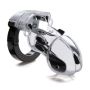 De Pubic Enemy No 1 is onze nette en transparant cock cage met e-stim functie: hij laat je een onstuimige piemel opgekropt achter slot en grendel houden, zodat hij niet stijf kan worden totdat de meesteres, of de meester, met de sleutel komt en hem eruit laat. Met de geleidende oppervlakken, links en rechts, kan de gevangene naar hartelust worden behandeld met tintelingen, samentrekkingen of pulsaties in precies de intensiteit die hij verdient. Omdat zijn geleidende oppervlakken in een mum van tijd eruit gehaald kunnen worden, is onze kuisheidsgordel perfect voor eigenzinnige heren, zelfs voor degenen die e-stim nog niet ontdekt hebben. En als een gevangene later verwaand blijkt te worden, kan de geleidbaarheid gemakkelijk worden hersteld.