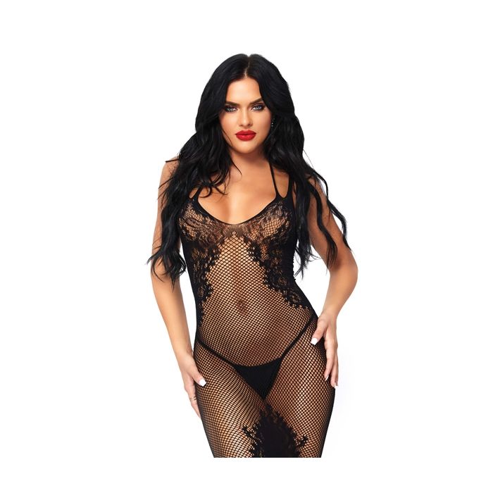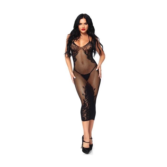 De spannende Naadloze Netstof Jurk met Kant van LegAvenue laat je er adembenemend mooi uitzien. Deze lange jurk is gemaakt van netstof materiaal en de delen van sierlijk bloemen kant en de lengte van de jurk maken dit design zeer elegant. De jurk zit nauwsluitend om je lichaam en aan de achterzijde is een strook van bovenaan de rug tot onderaan de jurk gemaakt van netstof met grote mazen, waardoor het lijkt op een rijgveter.