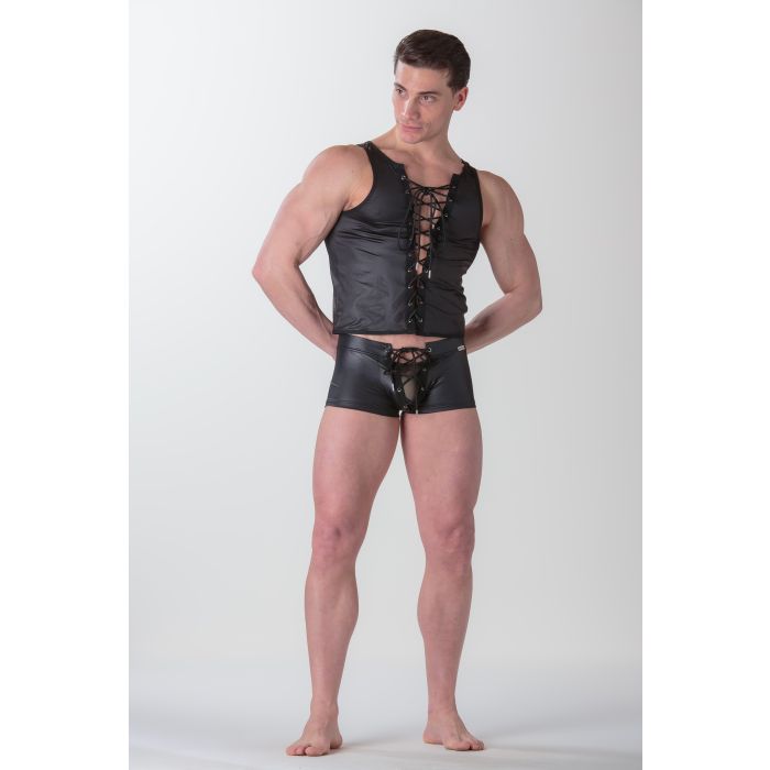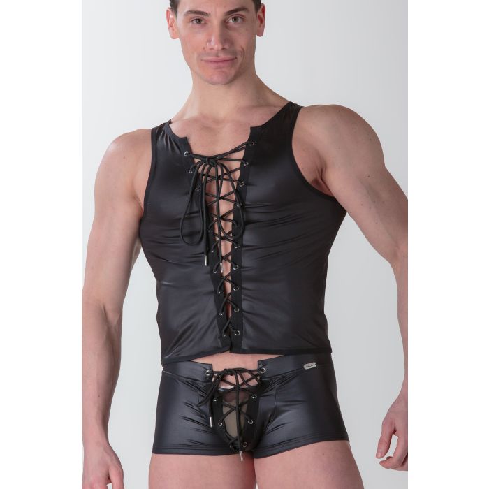 Maak een statement met deze sexy en provocerende tanktop, perfect voor diegenen die hun innerlijke zelfverzekerdheid willen omarmen. Gemaakt van rekbaar polyester, biedt deze top niet alleen een gedurfde uitstraling, maar ook een comfortabele pasvorm die je de hele avond laat stralen. De corset-stijl vetersluiting aan de voorkant voegt een speelse, maar toch verfijnde touch toe, waardoor je een onweerstaanbare look creëert die zeker de aandacht zal trekken.