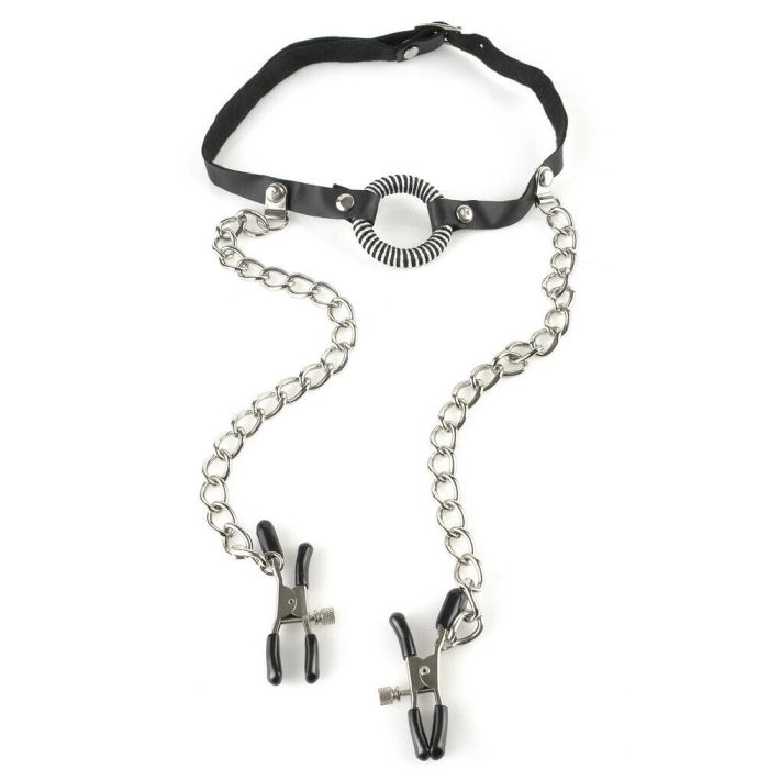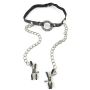 Met deze o-ring gag met tepelklemmen ben jij gegarandeerd van een super kinky bdsm avond. Dit gaat al jouw fantasieën te boven, een o-ring gag in je mond waar ook nog eens tepelklemmen aan vast zitten die heerlijk jouw tepels gaat pijnigen. De straps die vanaf de gag om de nek vast is is te zetten is verstelbaar en gemaakt van leer De gag is van stevig materiaal waardoor je mond goed open blijft staan. De kettingen lopen naar beneden richting de tepels en om de klemmen heen zitten twee rubberen kapjes zodat ze goed blijven zitten.