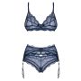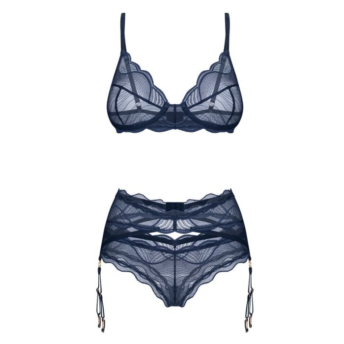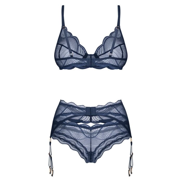 Maak kennis met de Nightly Blue set van Obsessive, een sensueel en elegant ensemble dat perfect is voor een speciale gelegenheid of gewoon om jezelf te verwennen. Deze set bestaat uit een beugelbh, een jarretelgordel en een string, allemaal ontworpen met een verfijnde kantlook in een prachtige blauw-op-blauw kleurstelling. De combinatie van transparante materialen en delicate details zorgt voor een onweerstaanbare uitstraling die je zelfvertrouwen een boost geeft.