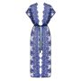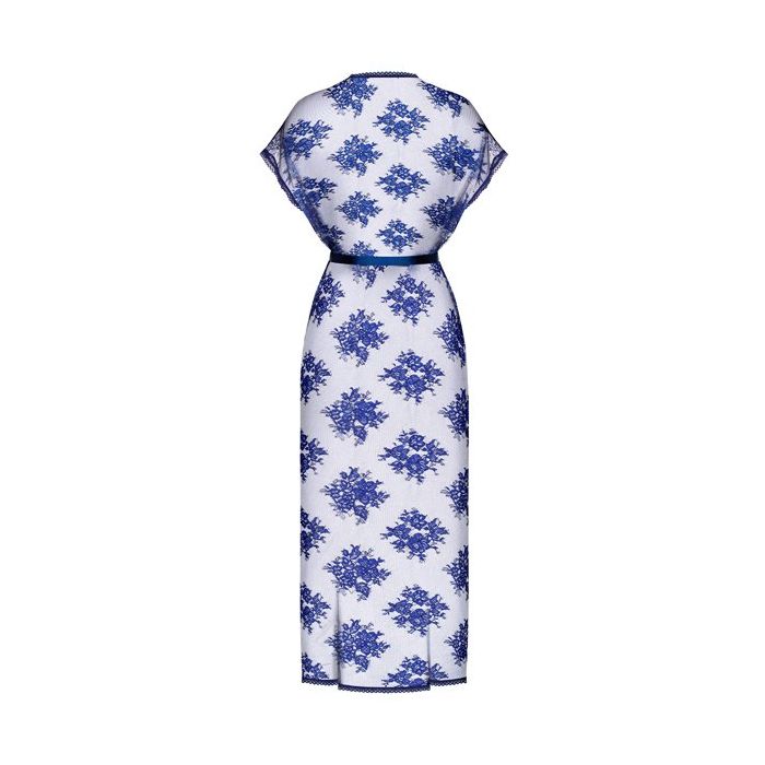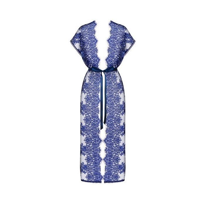 Het lange model van de peignoir geeft een chique uitstraling en de kapmouwen en het blauwe strik lint maken deze look helemaal compleet!