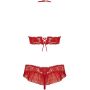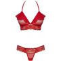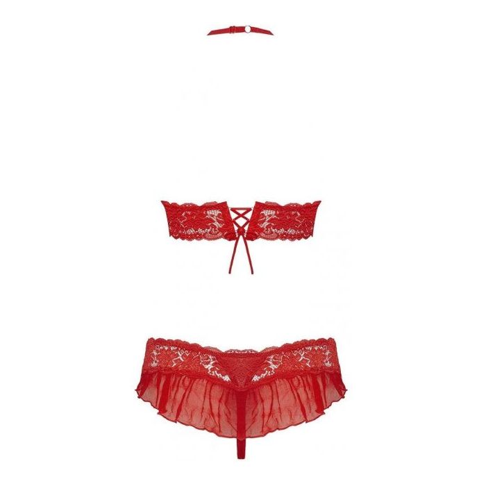 In de Obsessive Halter Bh Set 863 - Rood ben jij klaar voor een geile avond vol passie en plezier. In deze spannende set voel jij je heerlijk zelfverzekerd en vrouwelijk. De halter bh heeft doorzichtige cups waarover speelse rushes vallen. Ook de string is afgewerkt met rushes, die over jouw billen vallen. De rushes bewegen uitnodigend mee met jouw bewegingen.