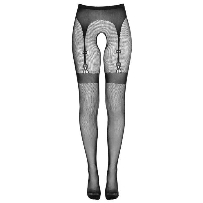 Deze uitdagende panty van Cottelli Collection heeft een open kruis en is gemaakt van elastische netstof. De panty is afgewerkt met ingeweven jarretelgordel, kousenband en een naad aan de achterkant.