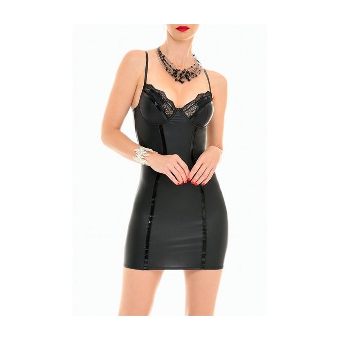 Het Amelie Jurkje heeft een luxueuze uitstraling en is voorzien van ondersteunende beugels die zijn afgewerkt met randen sierlijk kant en wetlook stroken. Vanaf de onderkant van de cups lopen wetlook stroken over de gehele lengte van de voorkant naar beneden en op de achterkant lopen de schouderbandjes door in wetlook stroken over de gehele lengte. In de achterkant is een zilverkleurige rits gezet, zodat je jurkje makkelijk aan en uit krijgt.