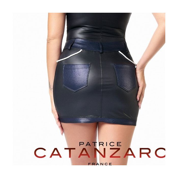 Het spannende Peggy Mini Rokje - Zwart / Blauw is een design rokje uit de collectie van het erotische fashion merk Patrice Catanzaro. Het rokje is gemaakt van materialen van hoge kwaliteit, voor een geweldig draagcomfort en een perfecte pasvorm. Het mat zwarte kunstleren mini rokje zit lekker strak om jouw vrouwelijke vormen en de brede tailleband zit op normale hoogte. De tailleband, de zoom onderaan en de leuke kont zakjes zijn gemaakt van stof met een denim look en metallic afwerking. De donkerblauwe details en de touwen die om de heupen vallen geven een maritiem gevoel.
