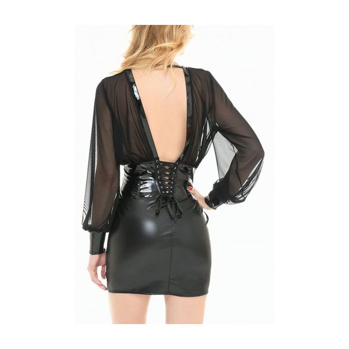 Het Robyn Jurkje lijkt een blouse, met een rokje en een korset, maar deze onderdelen vormen samen een super sexy mini jurkje. De bovenkant is gemaakt van doorschijnend tule, met een laag uitgesneden decolleté en lange mouwen. Aan de uiteinden van de mouwen zijn brede wetlook boorden aangebracht voor een chique uitstraling. Rond de taille komt het wetlook vinyl terug in een brede band rondom je middel met zilverkleurige studs als knoop details aan de voorkant en een geregen striklint aan de achterkant voor een korset look. Het korte rokje is gemaakt van mat zwart materiaal voor een stoere twist.