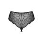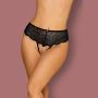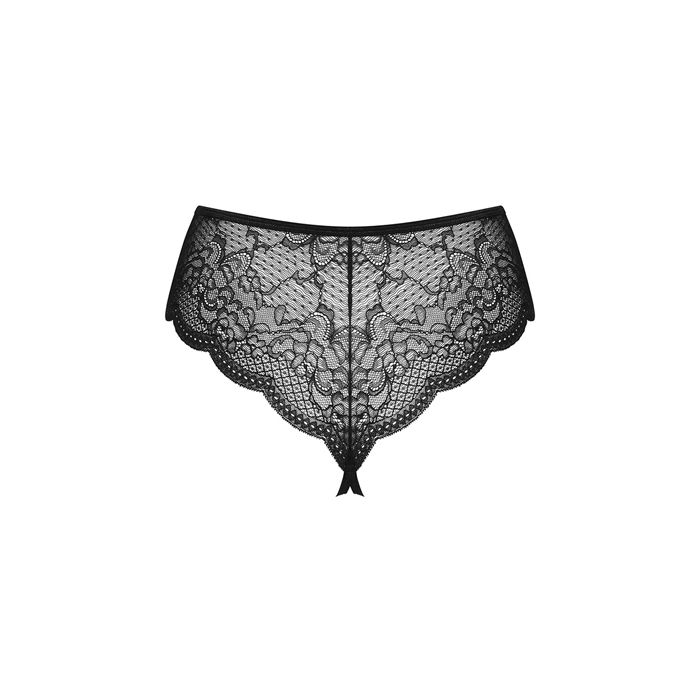 Aan de voorkant lopen smalle bandjes langs het uitdagende open kruis. Tussen het kant en de smalle bandjes zijn parel kettinkjes gespannen. Aan de achterkant worden de billen prachtig omlijst en benadrukt door de geschulpte randen.
