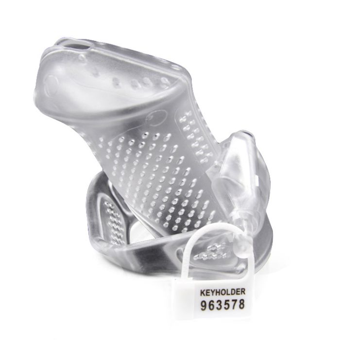 De Peniskooi Airmesh Chastity Cage - Transparant is een op maat verstelbare kuisheidskooi gemaakt van stevig kunststof, perfect voor langdurig dragen. De kooi is comfortabel dankzij het lichtgewicht materiaal en de ventilatiegaatjes, waardoor je bijna vergeet dat je op slot zit. Met drie verschillende maten ergonomisch vormgegeven cockringen past de kooi altijd goed en knelt niet af. Zorg ervoor dat de cockring strak genoeg zit om de pik niet toegankelijk te maken, maar niet te nauw om circulatieproblemen te voorkomen. Het slotje is naadloos geïntegreerd voor maximaal draagcomfort en gemak.