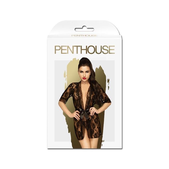 De Penthouse Sweet Retreat Kimono - Zwart is een luxe en romantische kimono. Deze kimono is geheel gemaakt van kant en wordt geleverd met een kanten string en een satijnen strik ceintuur.