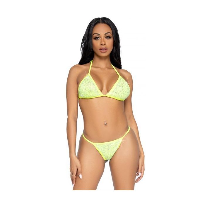 In de sprankelende Phoenix Bikini Set - Geel maak jij een stralende indruk op het strand of bij een pool party. Deze tweedelige st heeft een opvallende neon gele kleur en is versierd met strass steentjes die schitteren in de zon. Ook in de club zul jij zeker opvallen wanneer de strass steentjes de lampen weerkaatsen.