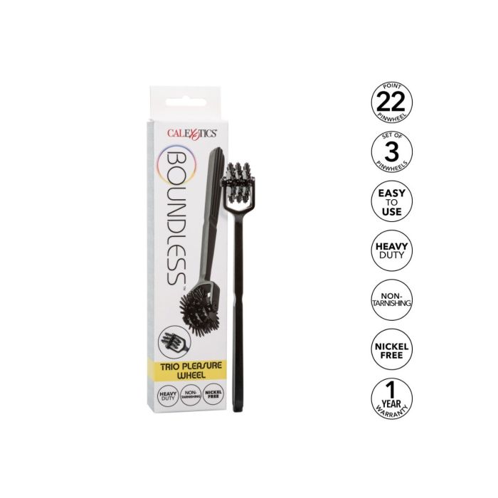 De Pleasure Wheel Boundless van CalExotics is gemaakt om te prikkelen met drie 22-punts roterende pinwheels. Zie jij pijn als ultiem genot? Rol het wiel over je lichaam, druk harder en de naalden zullen zich nog dieper in je lichaam kerven. Stimuleer al je zenuwen en ontdek welke lichaamsdelen het meest gevoelig zijn.
