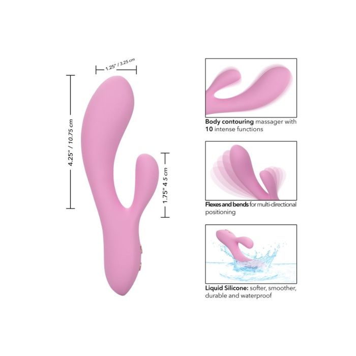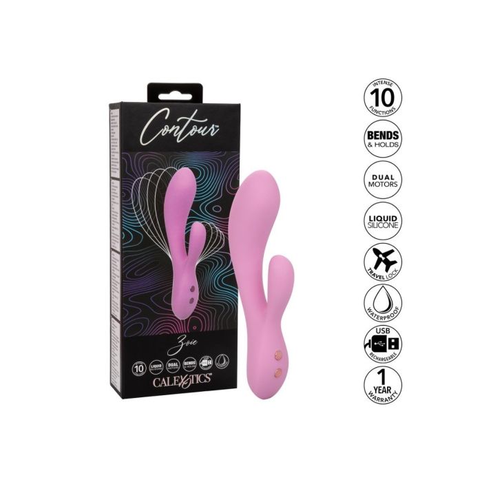 De Rabbit Vibrator Contour Zoie van CalExotics heeft een extreem flexibele schacht en clitoris stimulator. De 10 verschillende standen zijn gemakkelijk te bedienen op het speeltje zelf. Deze krachtige dubbele stimulator is gemaakt met een gebogen G-schacht en een natuurlijk gevormde stimulator om je meest intieme rondingen te plezieren. Zoie is waterdicht en oplaadbaar met de meegeleverde USB oplaadkabel. De vibrator is opgeladen in 2.5 uur en daarna 40-90 minuten gebruiken. Maak de vibrator na gebruik goed schoon met een toycleaner.