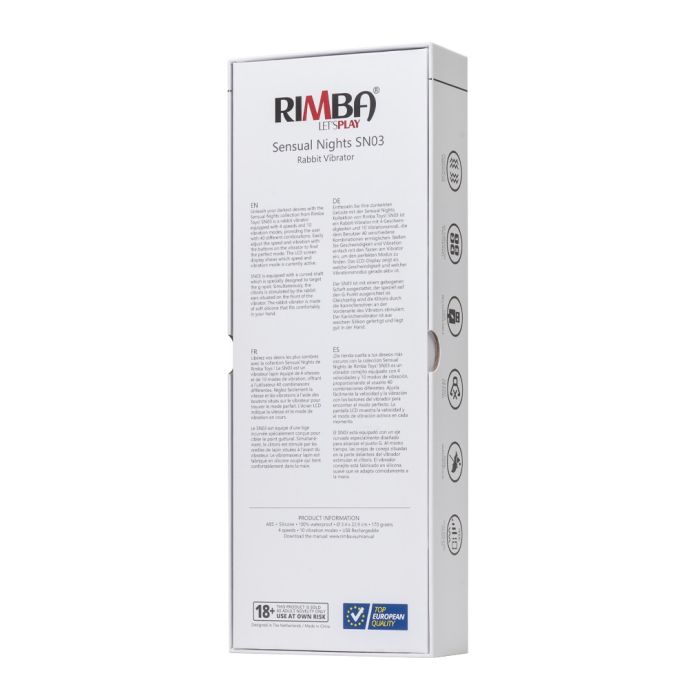 Ontketen je donkerste verlangens met de Sensual Nights collectie van Rimba Toys! SN03 is een rabbit vibrator die je zal laten genieten van intense sensaties. Met 4 snelheden en 10 vibratiestanden biedt deze vibrator maar liefst 40 verschillende combinaties om aan al je wensen te voldoen.