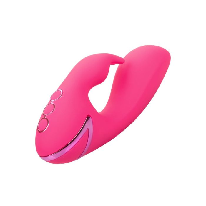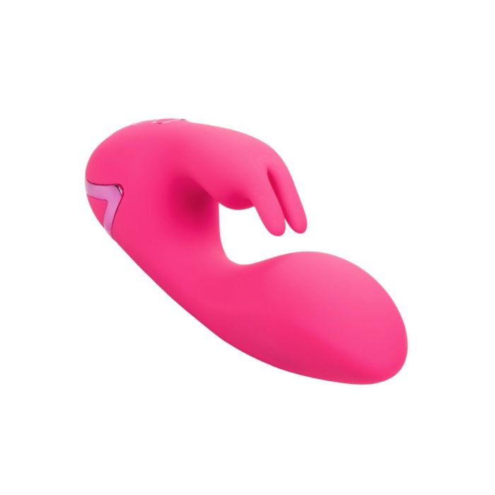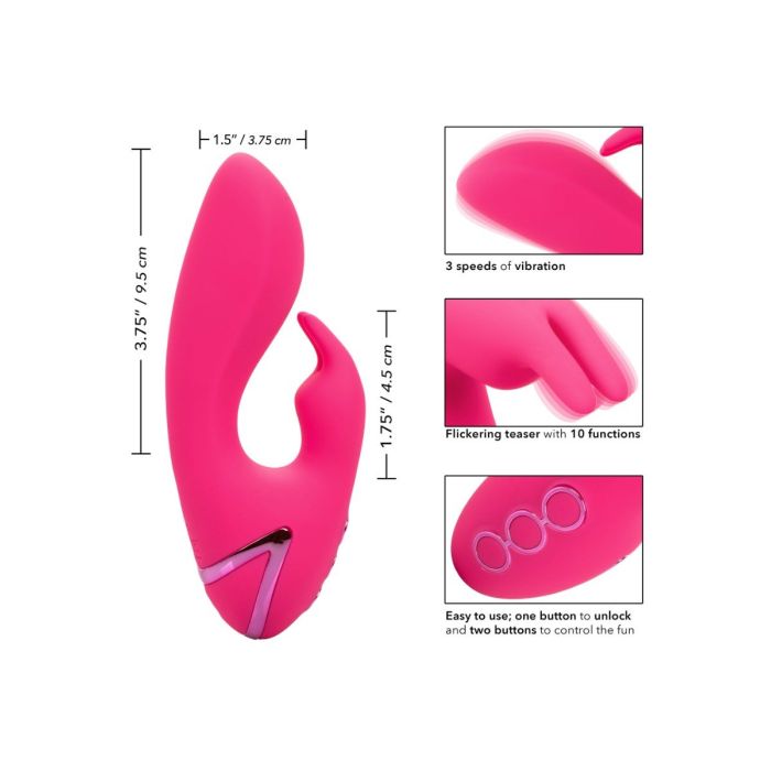De Rabbit vibrator So. Cal Sunshine van CalExotics heeft 10 intense vibratiestanden van de plagerige kietelaar, 3 snelheden van de kleine schacht en krachtige dubbele motoren. De gebogen schacht zorgt voor g-spot stimulatie terwijl je tegelijkertijd geniet van konijnoortjes die je clitoris stimuleren. Voor een ultra glad oppervlak is deze gebogen vorm en teaser bedekt met premium siliconen met slanke profielknoppen. De verschillende standen zijn eenvoudig te bedienen op het speeltje zelf. De premium siliconen materiaal zijn lichaamsveilig, ongeparfumeerd en ftalaatvrij om je meest gevoelige plekken gelukkig en gezond te houden. Laad de premium siliconen vibrator in 2,5 uur op met de meegeleverde USB-oplaadkabel om te genieten van 40 minuten snelle stimulatie of 90 minuten langzame vibraties.