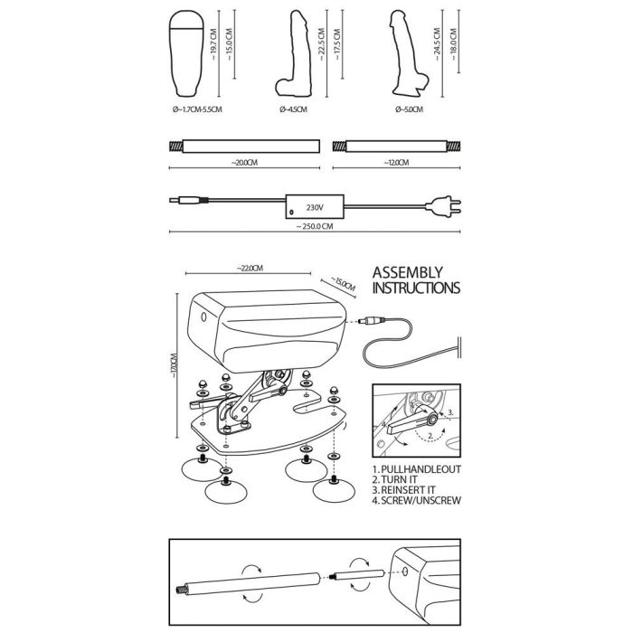 - Seksmachine (22cm x 15cm x 17cm), stang 12cm lang, verlengstang 20cm lang.