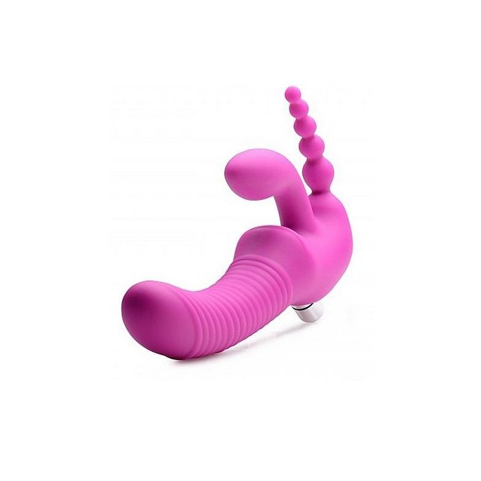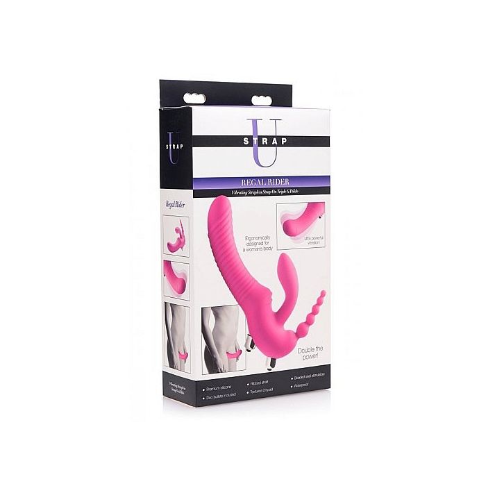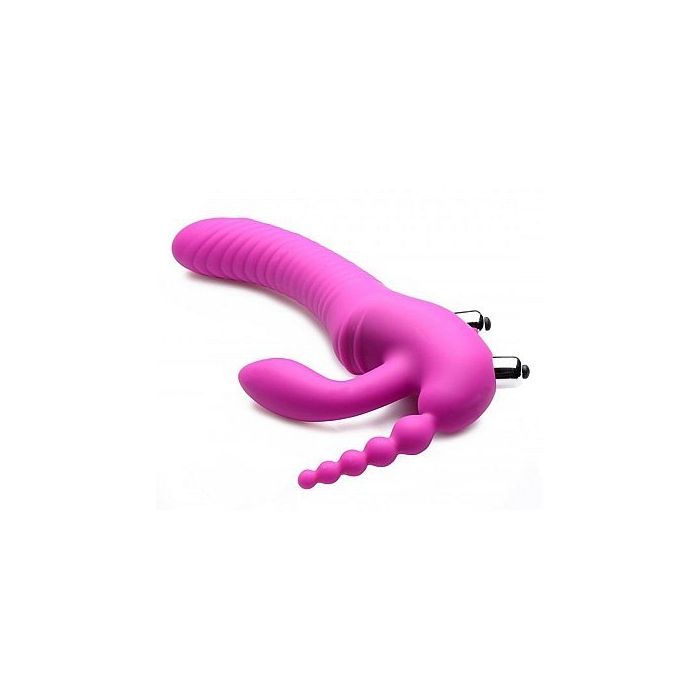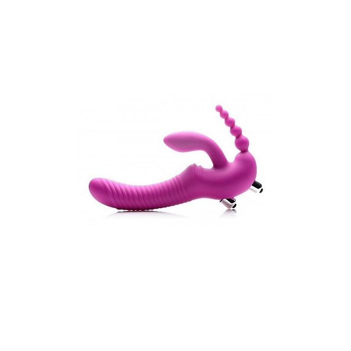 Ga voor een strapless strap-on die ergonomisch is ontworpen voor het vrouwelijk lichaam en wat de drager clitoraal, vaginaal en anaal plezier geeft terwijl de geribbelde schacht zijn of haar partner plezier biedt. Naast de ergonomische vormgeving zal deze strap-on door zijn twee krachtige bullets overheerlijke vibraties geven.. De inbrengbare gedeeltes voor de drager zijn in de vorm van een g-spot stimulator en analbeads voor anaal gebruik. Het gedeelte waar jij je partner mee zal bevredigen heeft stimulerende ribbels voor nog meer intense gevoelens. Aan de onderkant zijn twee bullets te bevestigen. Hierdoor is de strap-on makkelijk te reinigen nadat je ze het verwijderd en geeft het de strap-on enorm veel power. Verder is deze toy gemaakt van overheerlijk zacht materiaal welke lichaamsveilig is voor zorgeloos gebruik. Maak na afloop goed schoon onder de kraan met een milde zeep en een toycleaner.