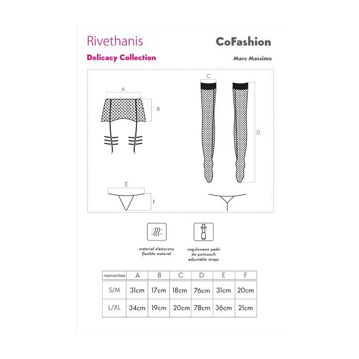 De sexy Rivethanis Jarretel Set met Kousen komt uit de Delacacy serie van het merk CoFashion. Deze spannende set bestaat uit een jarretel gordel, een string en kousen. De brede jarretel gordel zit lekker strak rond de heupen. Het netstof heeft een speelse structuur. De jarretelbandjes zijn verstelbaar en rond de bovenbenen zijn extra bandjes aangebracht. De pareltjes geven de set een luxe aanblik.