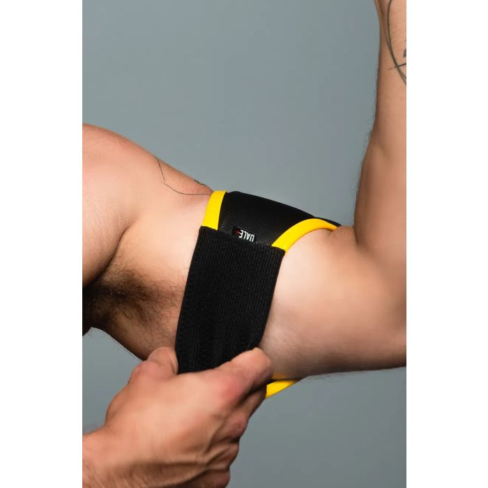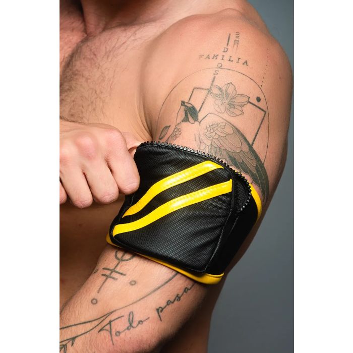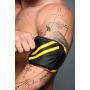 Het verstelbare klittenbandsysteem maakt het eenvoudig om het bandje aan te passen aan verschillende armomtrekken, waardoor het beschikbaar is in drie maten: S, M en L. Dit betekent dat iedereen, ongeacht lichaamsbouw, kan genieten van de voordelen van dit trendy accessoire. De gedurfde combinatie van zwart en geel geeft een krachtige uitstraling die perfect is voor zowel casual als formele gelegenheden. Combineer het bandje met een leren short of een jockstring voor een gedurfde en sexy look die zeker de aandacht zal trekken.