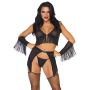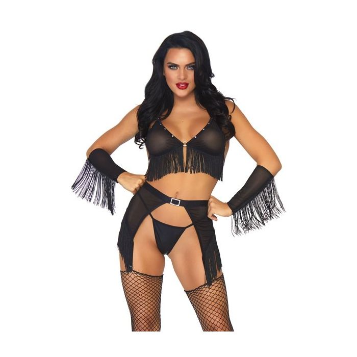 In de Roleplay Ride Em Cowgirl Set van Leg Avenue kruip jij in de huid van een stoere cowgirl en ben jij klaar voor de rodeo! De 4-delige set bestaat uit een top, armbanden, een jarretelgordel en een bijpassende string. De set is afgewerkt met sierlijke details en speelse franjes en laat jouw er super sexy uitzien.