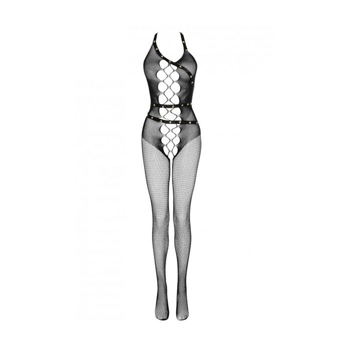 Maak de avond net even iets pikanter met de Sacnite Bodystocking met Gouden Studs uit de collectie van Livco Corsetti. De bodystocking heeft een halter model met een bijzonder bandje. Het bandje loopt rond de nek, over het decolleté en twee keer rond de taille en is versierd met goudkleurige piramide studs voor een stoere look. De bodystocking is lekker strak en gemaakt van stretch netstof met mazen in verschillende maten. Aan de voorkant heeft de bodystocking grote mazen die naar beneden en over het kruis door naar achteren lopen waardoor jouw meest intieme plekjes vrij zijn om aangeraakt te worden.