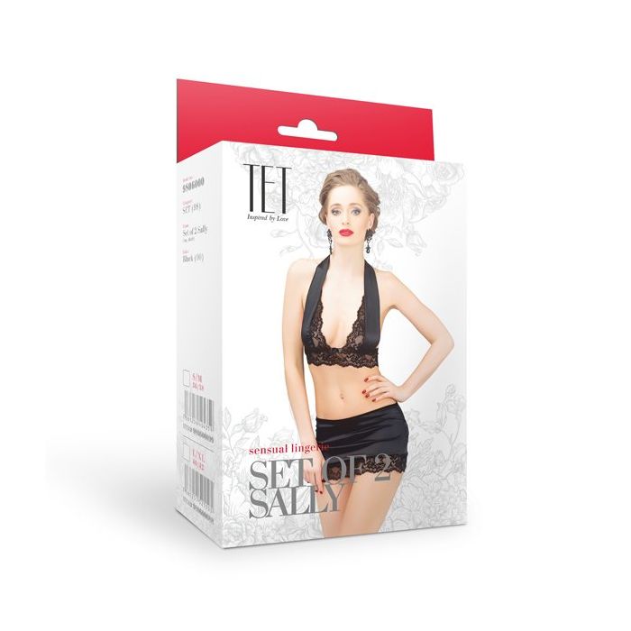 Een sexy halter top en een lekker strak mini rokje. De perfecte combinatie voor een avond vol passie! De Sally Set - Zwart komt uit de collectie van TET Lingerie. De top en het rokje zijn beiden gemaakt van hoogwaardige materialen. Het glanzende satijn en het bloemen kant geven samen een charmante look.
