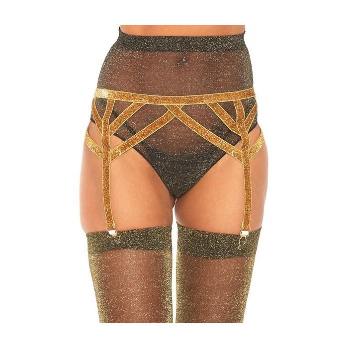 De Schitterende Glitter Jarretel heeft een stijlvol design en is gemaakt van elastische bandjes, bedekt met fonkelende goudkleurige glitters. De glitters maken deze jarretel perfect voor een kinky feestje of om op feestelijke wijze je partner te verrassen. Onderaan de jarretelbandjes is de jarretelgordel voorzien van metalen clips met silicone om kousen aan te bevestigen voor een complete sexy look.