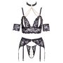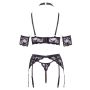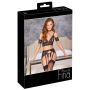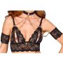 De Abierta Fina jarretelset is een onweerstaanbare combinatie van sensualiteit en elegantie. Deze set bestaat uit een prachtig bh-topje, een verleidelijke jarretelgordel en een kruisloze string, allemaal vervaardigd uit fijn zwart bloemenkant dat subtiel is afgewerkt met gouden accessoires. Het bh-topje is ontworpen met open softcups en een schattige hanger van kleine hartjuwelen, terwijl de verstelbare bandjes en haaksluiting op de rug zorgen voor een perfecte pasvorm. De afneembare karabijnkettingen kunnen eenvoudig worden bevestigd aan de sierringen, waardoor je de mogelijkheid hebt om de bijgevoegde elastische kanten armwarmers te gebruiken voor een extra sensuele uitstraling. De jarretelgordel is uitgerust met drie verstelbare jarretelbandjes aan elke kant en een haaksluiting aan de achterkant, zodat je je look kunt aanpassen aan elke gelegenheid. De kleine string, met een stimulerende ketting in het open kruis, voegt een speelse touch toe en kan ook worden verwijderd voor een meer ingetogen look. Deze set is niet alleen een lust voor het oog, maar biedt ook een hoog draagcomfort dankzij het zachte en elastische materiaal. Verwen jezelf of verras je partner met deze betoverende set die elke avond omtovert tot een onvergetelijke ervaring!