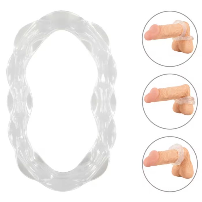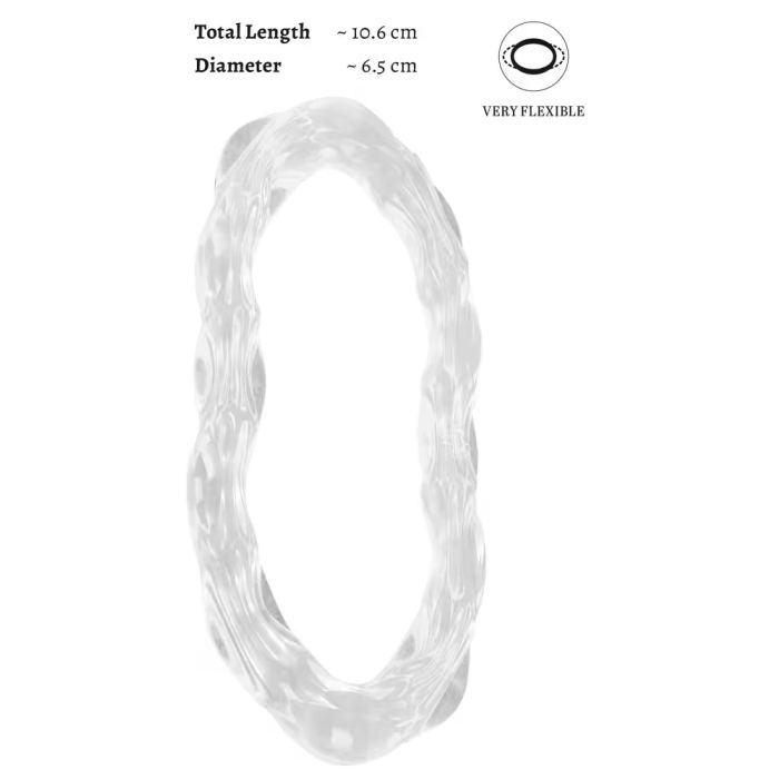 Deze zeer elastische ring wikkelt zich strak om de penis en/of testikels, waardoor je een intens gevoel van grip en ondersteuning ervaart. Dankzij het innovatieve ontwerp van de grotere, transparante siliconen ring kun je deze eenvoudig tot een acht vouwen, wat zorgt voor veelzijdig gebruik en aanpassingsmogelijkheden. De zachte, golvende structuur biedt niet alleen een comfortabele pasvorm, maar ook een slipvrije grip die je tijdens je meest spannende momenten niet in de steek laat.