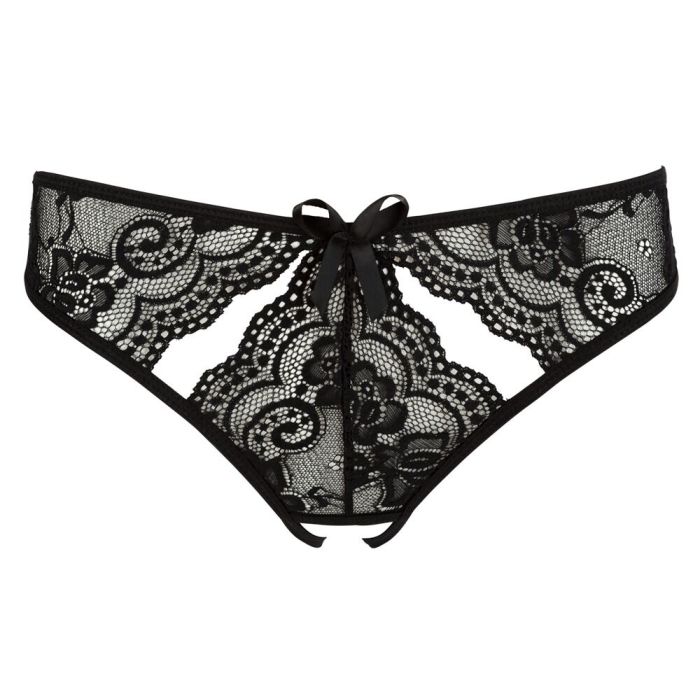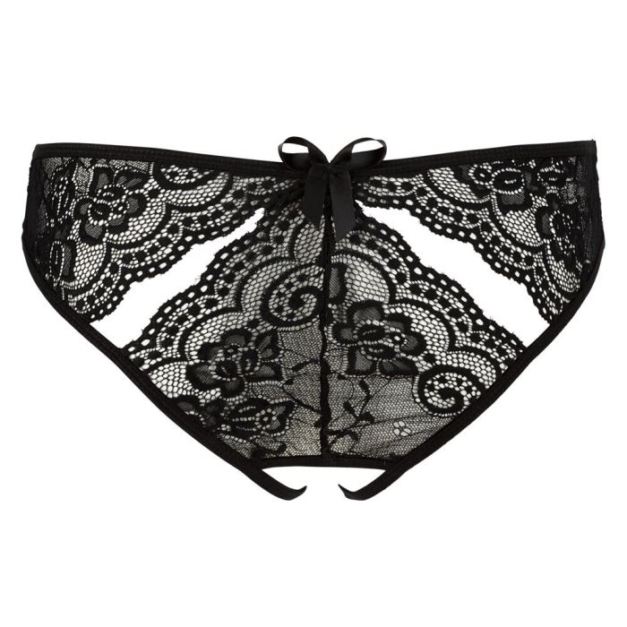Voor een kinky nachtje ga jij voor deze geweldige slip met open kruis van mandy mystery. De slip is volledig open zodat jij snel toegankelijk bent van voren en van achteren. Het schitterende kant voelt zacht aan op de huid en heeft sierlijke vormen voor een romantische look. De strikjes aan de voorkant en aan de achterkant geven een liefelijke uitstraling.