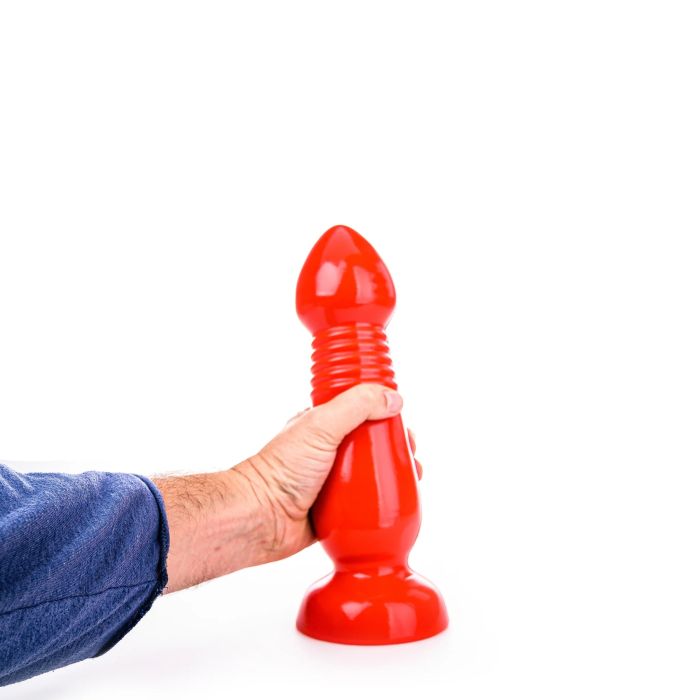 Deze rode speervormige dildo van het merk All Black heeft maar één doel voor ogen en dat jou een nacht te bezorgen die je niet snel zal vergeten. Deze Buttplug heeft niet alleen een indrukwekkend formaat met een lengte van 27,5 cm en diameter van 7,5 cm, maar ook indrukwekkende vormen. De grote spitse eikel zal die bij je naar binnen dringen terwijl de geribbelde schacht een intense stimulatie teweeg brengt. Ontdek het genot van heerlijk diepe penetratie en ervaar hoogtepunten als nooit tevoren. Deze speervormige dildo beschikt over een handige zuignap die je op elke vlakke ondergrond kunt plaatsen. Hierdoor kun je samen of alleen handsfree genieten van deze grote zwarte dildo van zacht vinyl. Gebruik glijmiddel op water- of siliconenbasis voor een comfortabel gebruik.