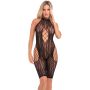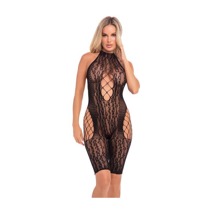 De bodystocking is gemaakt van netstof met panter print, delen van netstof met grove mazen en stroken gestreept netstof. Dit zorgt voor een speels geheel. Het halter model en de bikershort lengte geven een vlotte uitstraling.