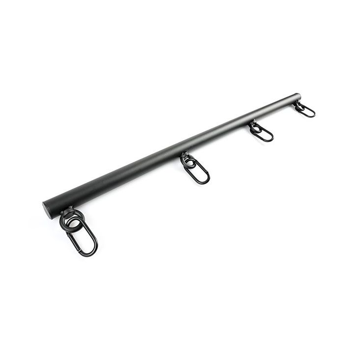 In de doos vind je een massief matzwart nikkelvrij aluminium buis van 63,8 cm met 4 gelaste connector O-ringen. Daarnaast bevat de set 4 kunstleren manchetten met gespsluiting en karabijnhaak connector.